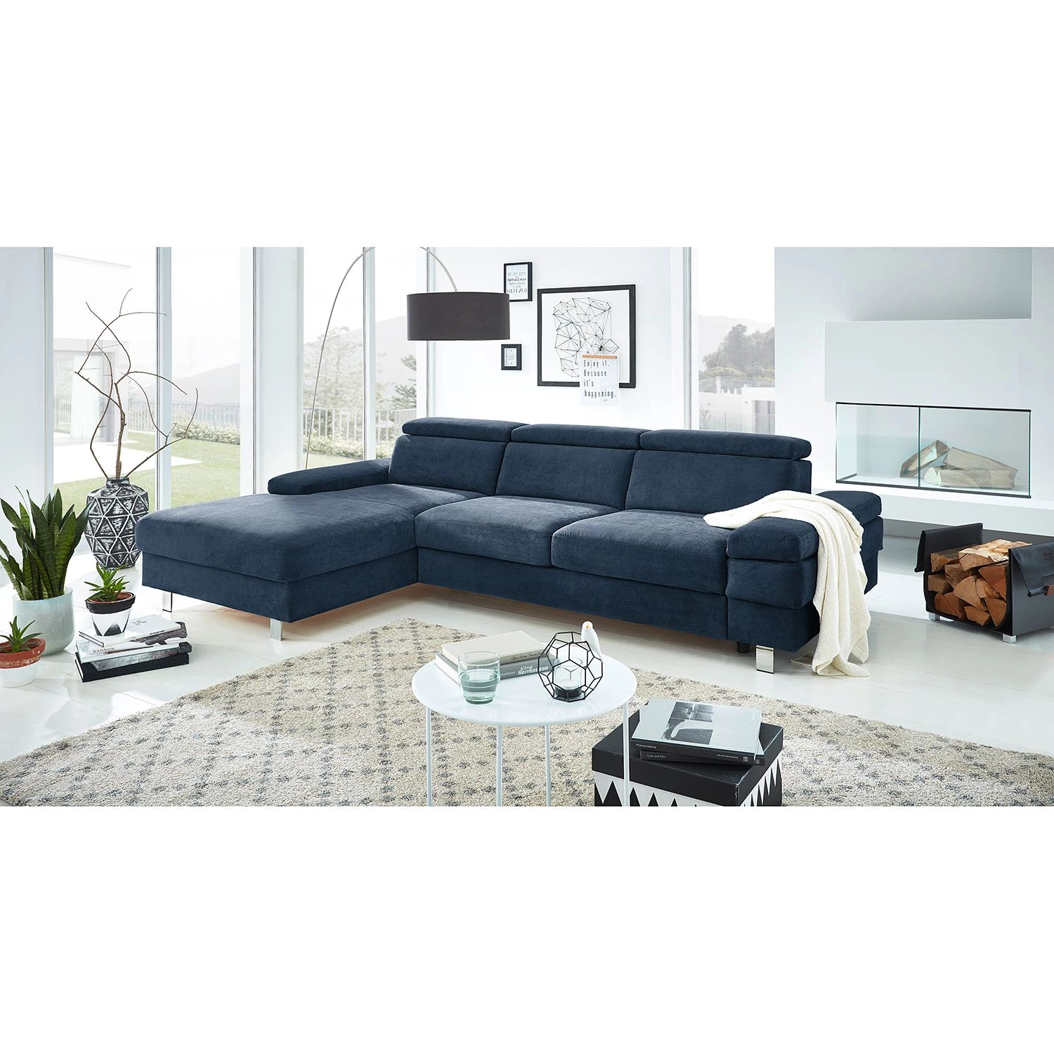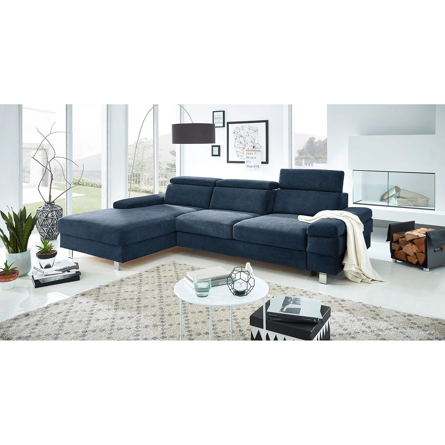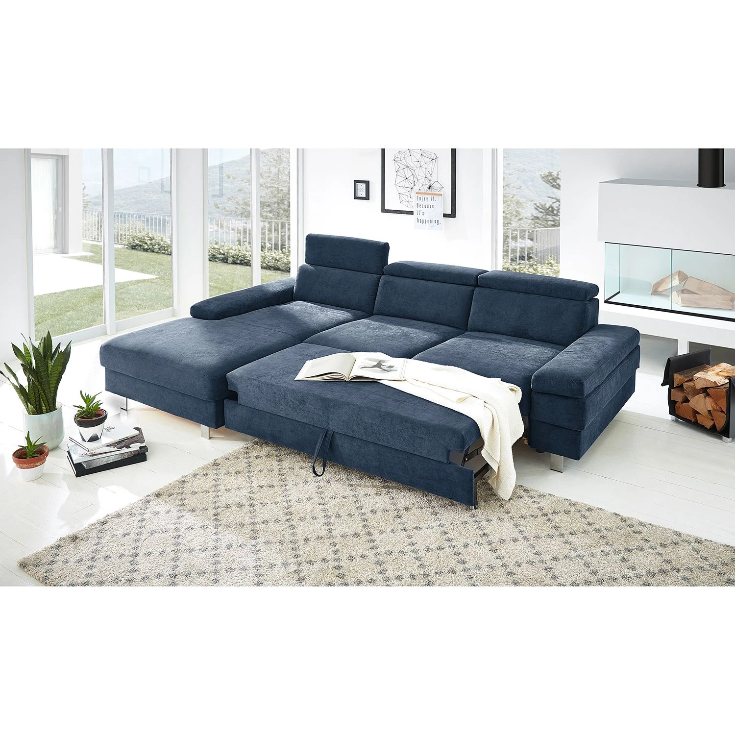 - Contenu de la livraison : Canapé d’angle avec fonction couchage sur tiroir, appuie-tête et profondeur d’assise réglables