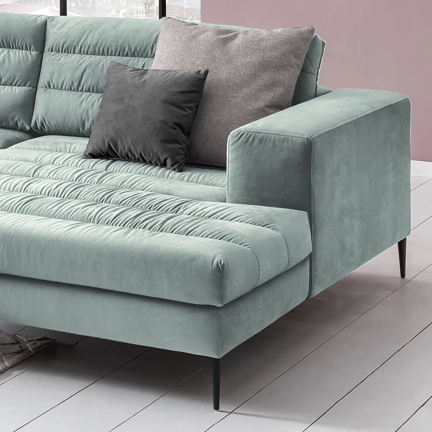 - Contenu de la livraison : Canapé d’angle 2 éléments, sans coussins décoratifs, avec repose-pieds