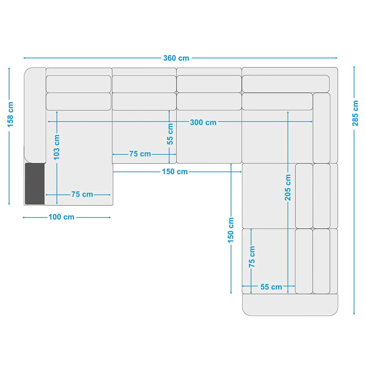 - Profondeur de la méridienne courte : 158 cm