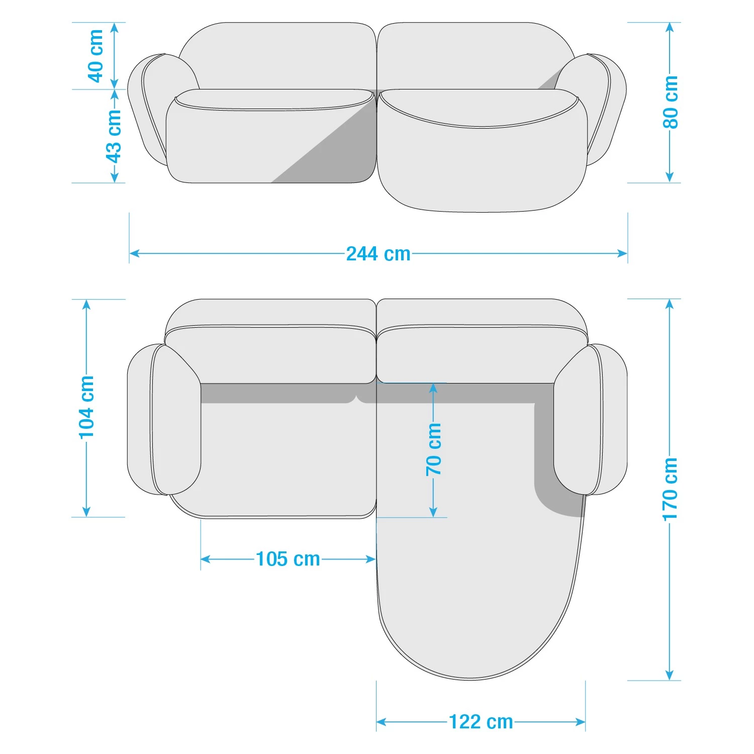 - Profondeur de la méridienne courte : 170 cm